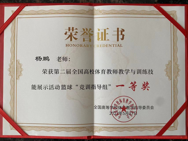 本次全国高校体育教师教学与训练技能展示活动共有来自全国各地200余名高校体育教师参加。比赛内容由说课与课堂教学(训练指导)、体能(90秒跳绳、四线折返跑)、专项技能(1分钟投篮、多种变相运球上篮)三个部分组成。杨鹏老师在篮球竟训指导组参赛选手中脱颖而出,以第一名成绩获得该组一等奖。