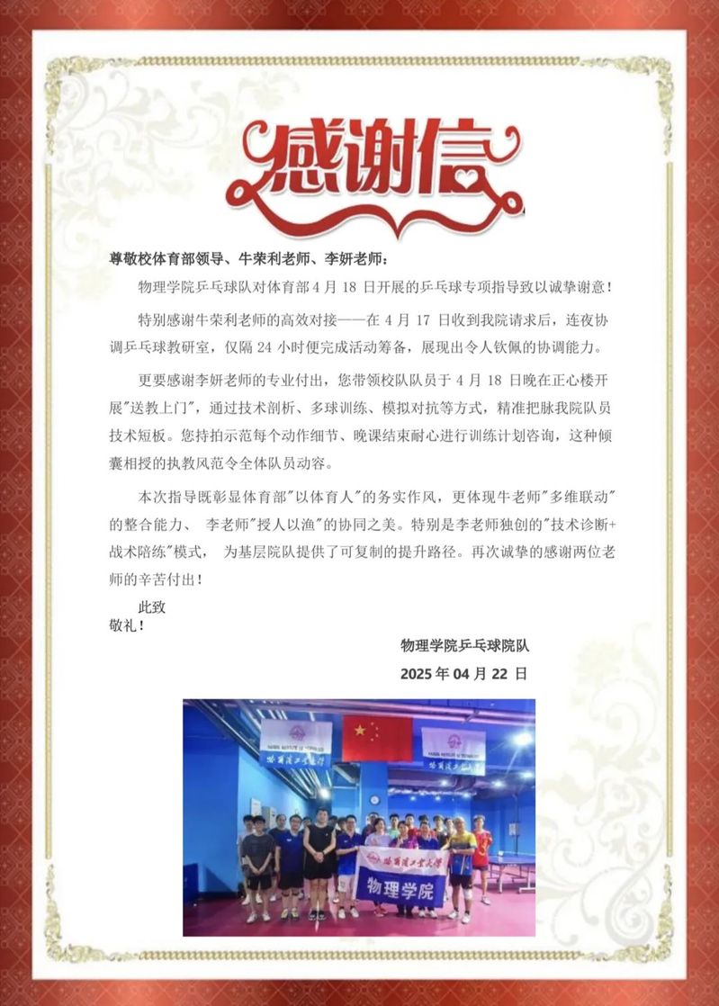 近日,永利官方网站物理学院发来感谢信。信中物理学院乒乓球队全体成员向yl6809永利领导及牛荣利老师、李妍老师致以衷心感谢,高度赞誉其高效协作与专业奉献精神。