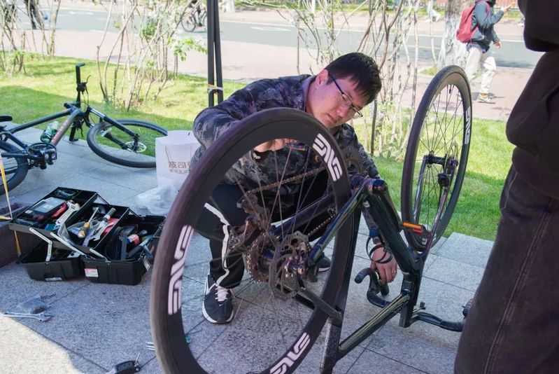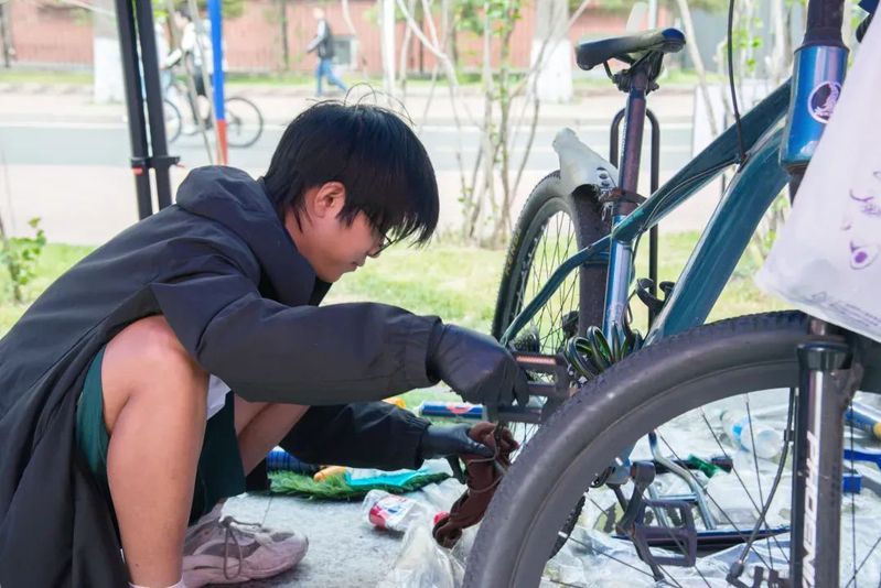 在基础检修区,志愿者们熟练地为自行车进行轮胎充气、链条润滑、变速器调试、刹车调试、螺丝紧固、异响检测等服务。他们认真地检查每一辆自行车的各个部件,确保车辆的正常运行。对于一些复杂的故障,志愿者们也凭借丰富的经验和专业的技术,迅速地找到了问题所在,并给予了解决方案。对于想要观摩和学习的车主,志愿者们也耐心进行维护指导,以便车主能自行养护爱车;对于损坏严重、基础检修无法解决的问题,志愿者也会仔细解释,以便同学们日后修车能对症下药。