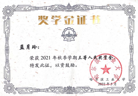 -2021秋季学期荣获三等人民奖学金