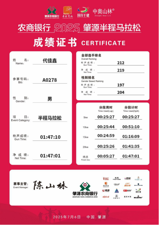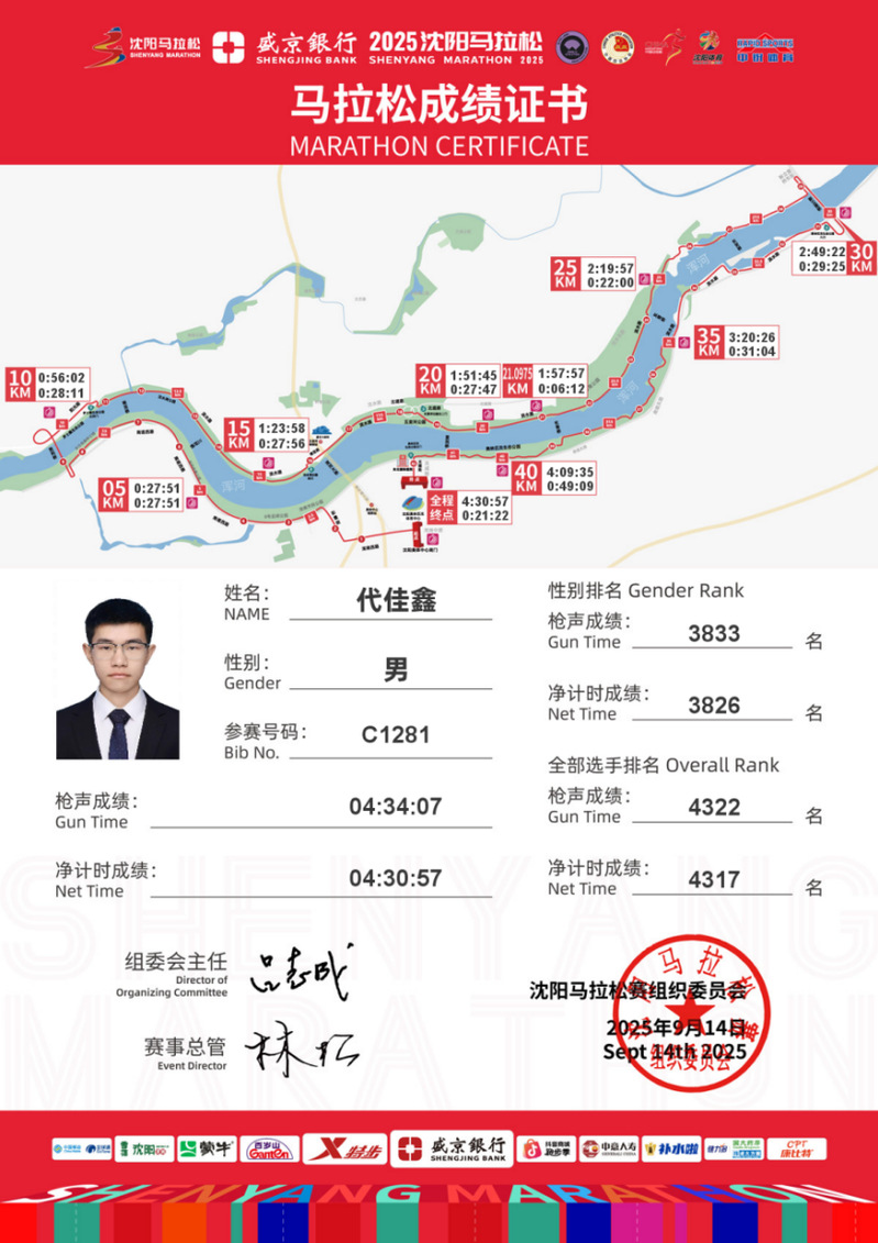 大学期间,我依旧坚持着跑步这一爱好,任务繁重的时候也不忘去田径场运动。我勇于挑战自我,并不断朝着更高水平冲击,2025年完成各类马拉松赛事近10场。“只在学业科研上埋头苦干很难实现个人的多元化发展,通过体育运动来加强身体素质、提高精神面貌,对个人的长远发展大有脾益。”