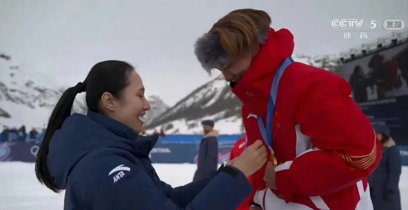 她为中国队首金获得者苏翊鸣颁发金牌
